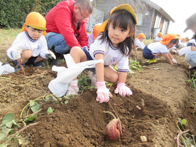 その後の収穫では、土の中から大きなさつまいもが顔を出すたびに歓声が響き渡り、「先生見て!」「こっちにもあったよ!」と大喜び。自分の力で掘り出した達成感と、自然の恵みへの感謝を感じる時間となりました。