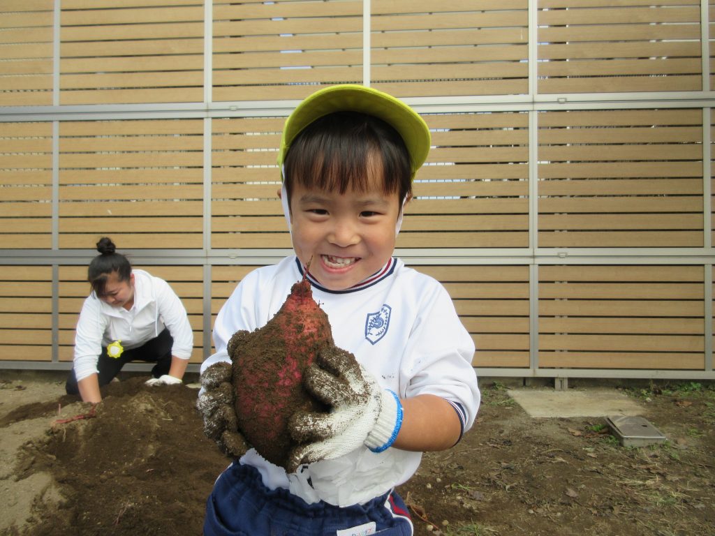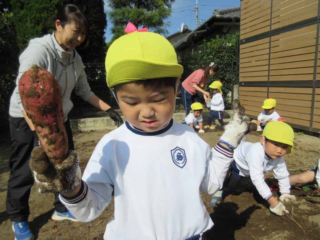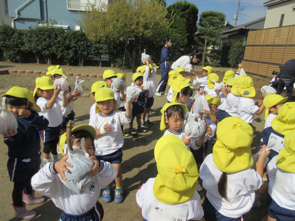 「これ、ぼくが植えたおいもかな?」「おうちで食べるんだ!」と、笑顔いっぱいの年少さん。自分たちの手で育て、収穫するよろこびを全身で感じる一日になりました。