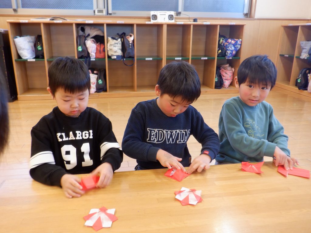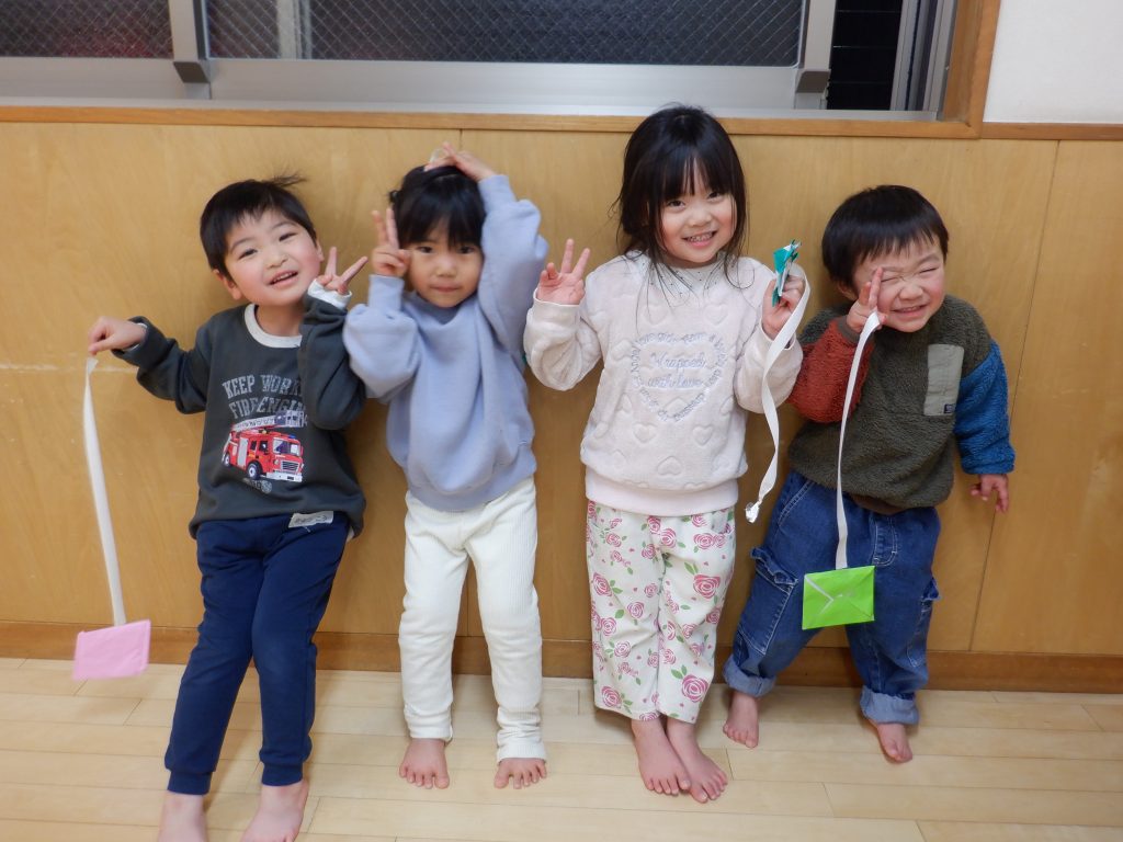 冬休み中に正月飾りやこま、羽子板等を作りました!自由遊びでは、正月遊びでは夢中の子ども達です♡