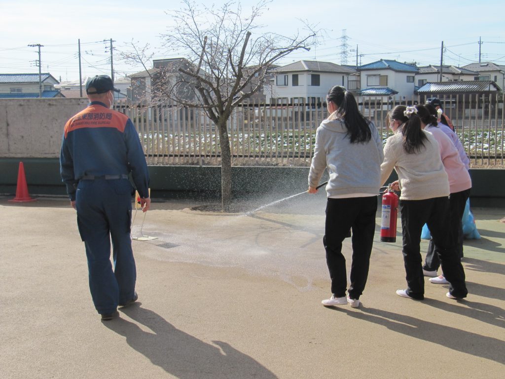 消火訓練では、子どもたちの応援の下、先生たちも真剣に取り組んでいました。