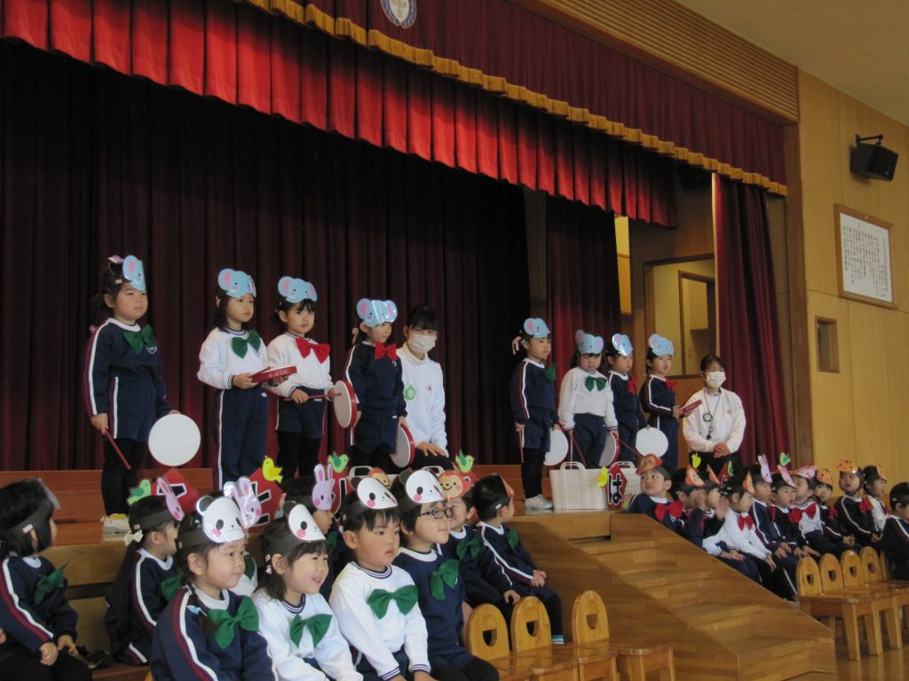 後半は、子どもたちが動物に扮しての「森の音楽会」。それぞれが担当の楽器を持ち、合奏と合唱に挑戦しました。ぴったり息が合う場面もあれば、少しだけタイミングがずれる場面もありましたが、それも含めて「ことり組らしさ」あふれる温かい演奏でした。会場からは大きな拍手が送られ、なんと保護者の皆様からアンコールまでいただきました。