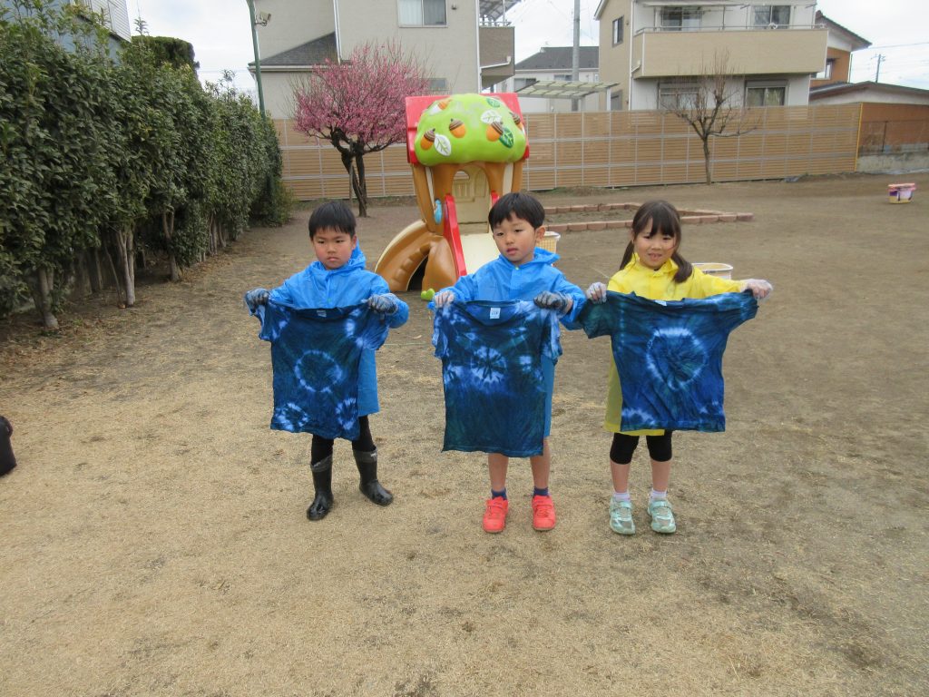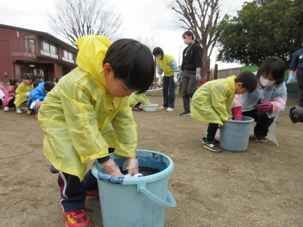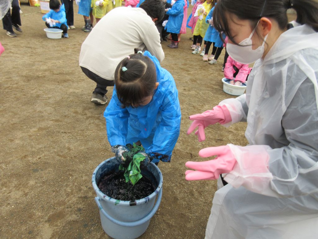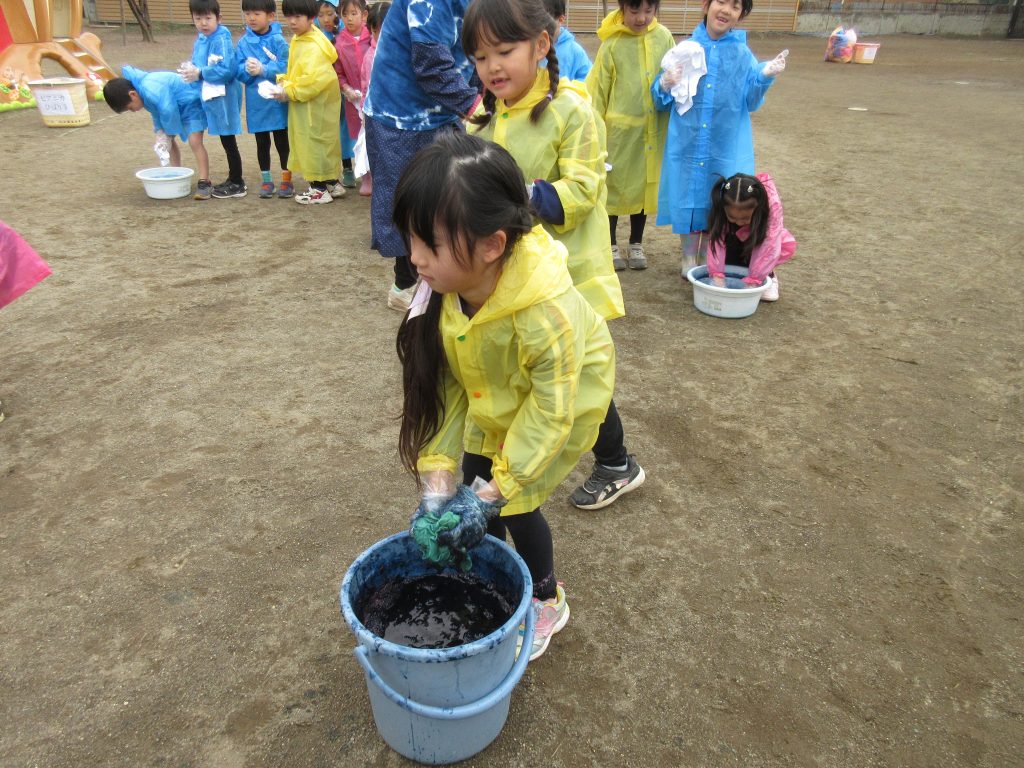 子どもたちは、事前に「どんな模様にしたいか」を考えながら、Tシャツをゴムでしばる準備をしていました。模様を思い浮かべながら丁寧にしばったそのTシャツを、いよいよ藍の液に浸します。