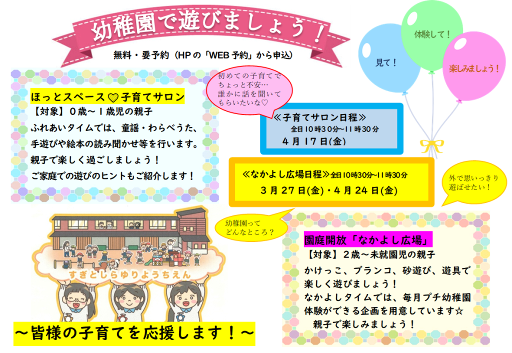 【対象】 2歳~未就園児の親子 定員40組(前日までに予約)